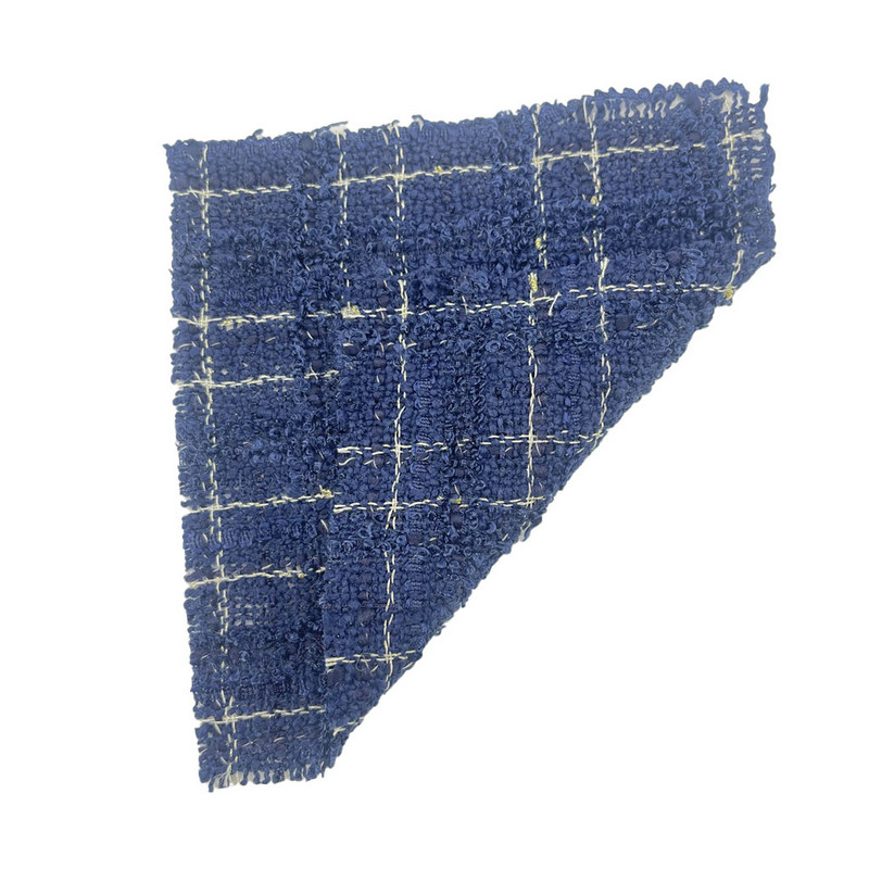 Fabrik ini, yang ditetapkan sebagai artikel 19909-10, ialah 100% poliester tweed yang direka untuk pakaian wanita. Dengan jisim seunit luas 558g/m, ia membentangkan struktur berat sederhana. Pangkalan biru tua ditenun dengan corak kotak-kotak, disepadukan dengan benang metalik semasa proses pembuatan. Gabungan ini mencipta kontras dalam kedua-dua sifat visual dan sentuhan. Komposisi semua poliester memastikan kestabilan dimensi dan prestasi yang konsisten. Kemasukan unsur logam menambah butiran pemantul cahaya pada permukaan tekstil. Ciri-ciri ini menjadikan fabrik sesuai untuk pakaian di mana integriti struktur dan kesan hiasan diutamakan.