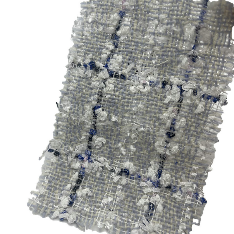 Fabrik ini, yang ditetapkan sebagai artikel 23510, ialah tekstil tweed yang terdiri daripada 45% bulu dan 55% poliester. Dengan jisim seunit luas 425 gsm, ia membentangkan pembinaan berat sederhana yang sesuai untuk kot. Fabrik ini menampilkan corak kotak-kotak biru, kelabu dan putih, disepadukan dengan motif rama-rama semasa proses tenunan. Gabungan ini mencipta kesan visual berlapis dalam struktur tekstil. Campuran bulu dan poliester menyumbang kepada kestabilan dimensi dan sifat terma fabrik. Ciri teknikal ini menjadikan tweed ini boleh digunakan untuk pakaian luar yang memerlukan kerumitan corak dan integriti struktur.