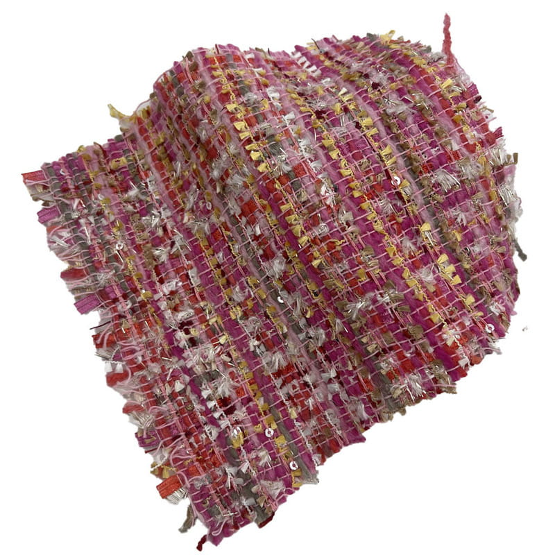 Fabrik ini, yang ditetapkan sebagai artikel 21003, ialah tekstil tweed yang terdiri daripada 67% poliester dan 33% akrilik. Dengan jisim seunit luas 385 gsm, ia membentangkan pembinaan berat sederhana. Fabrik ini menggabungkan labuci merah dan merah jambu yang digabungkan dengan benang metalik, disepadukan semasa proses tenunan untuk menghasilkan permukaan reflektif yang tersebar. Asas poliester memberikan kestabilan struktur, manakala komponen akrilik menyumbang kepada loteng dan tekstur fabrik. Gabungan ini menghasilkan bahan dengan pantulan cahaya yang pelbagai dan dimensi permukaan. Ciri teknikal ini menjadikan tweed ini boleh digunakan untuk pakaian wanita di mana elemen hiasan dan integriti struktur diperlukan.