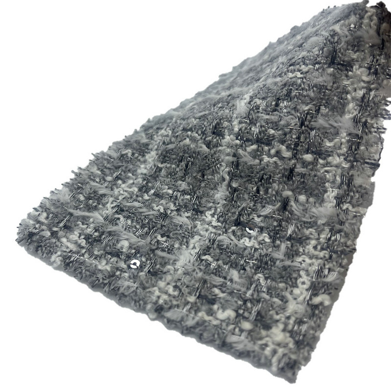 Fabrik ini, yang ditetapkan sebagai artikel 23503, ialah tekstil tweed yang terdiri daripada 49% akrilik, 40% poliester, 7% bulu dan 4% nilon. Dengan jisim seunit luas 335 gsm, ia memberikan pembinaan yang ringan namun berstruktur. Permukaannya menampilkan corak kotak-kotak kelabu halus, dicapai melalui proses timbul yang menghasilkan tekstur terangkat halus pada fabrik. Teknik ini meningkatkan kedalaman visual kotak-kotak tanpa mengubah asas tenunan. Campuran berbilang gentian menggabungkan kestabilan poliester, daya tahan akrilik, sentuhan semula jadi bulu dan ketahanan nilon. Ciri-ciri ini menjadikan fabrik sesuai untuk pakaian wanita di mana corak terperinci dan minat sentuhan diperlukan.