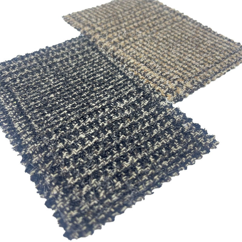 Fabrik ini, yang ditetapkan sebagai artikel 4336, ialah tekstil tweed yang terdiri daripada 5% bulu dan 95% gentian lain. Dengan jisim seunit luas 550 g/m, ia membentangkan pembinaan berwajaran berat. Permukaan hitam dan coklat menggabungkan corak cek dengan motif houndstooth, disepadukan dengan benang metalik semasa proses tenunan. Teknik ini mencipta reka bentuk komposit di mana corak geometri diserlahkan oleh unsur pemantul cahaya. Kemasukan benang metalik memperkenalkan kesan visual yang berbeza terhadap tapak tenunan. Spesifikasi teknikal menghasilkan bahan dengan kerumitan visual berbilang lapisan dan ketumpatan struktur, menjadikannya terpakai untuk projek yang memerlukan artikulasi corak dan variasi permukaan.