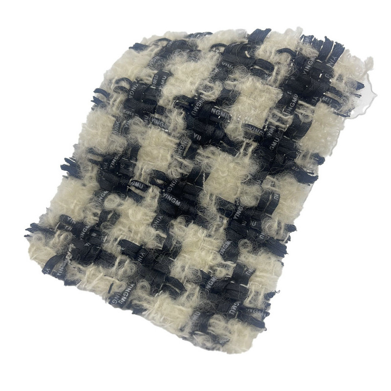 Fabrik ini, yang ditetapkan sebagai artikel 23548, ialah tekstil tweed bulu yang terdiri daripada 38% poliester, 36% bulu dan 26% kapas. Dengan jisim seunit luas 410 gsm, ia membentangkan pembinaan berat sederhana. Skema warna putih pudar dan hitam ditenun menjadi corak kotak-kotak, dipertingkatkan dengan teknik memberus permukaan yang menghasilkan tekstur seperti teddy yang terangkat. Proses kemasan ini membentuk permukaan padat, cerucuk pendek yang mengubah sifat sentuhan fabrik. Komposisi gentian menyumbang kepada kestabilan struktur fabrik dan pengurusan lembapan. Ciri-ciri ini menjadikan tweed berus ini boleh digunakan untuk pakaian yang memerlukan definisi corak visual dan tekstur permukaan yang tersendiri.