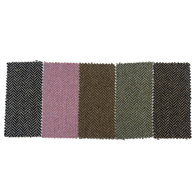 Fabrik ini, yang ditetapkan sebagai artikel 3532, ialah tekstil jacquard yang terdiri daripada 20% bulu dan 80% gentian lain. Dengan jisim seunit luas 500 g/m, ia membentangkan pembinaan berat sederhana hingga berat. Permukaan merah jambu menampilkan corak tulang herring yang dihasilkan melalui proses tenunan jacquard, yang membentuk motif berbentuk V yang tepat di seluruh fabrik. Teknik ini menghasilkan tekstur arah yang konsisten dengan ulangan geometri yang ditentukan. Komposisi campuran bulu menyumbang kepada sifat haba fabrik dan pengekalan bentuk. Ciri teknikal ini menghasilkan bahan dengan ketumpatan struktur dan kejelasan corak, menjadikannya terpakai untuk seluar yang memerlukan definisi visual dan kestabilan dimensi.